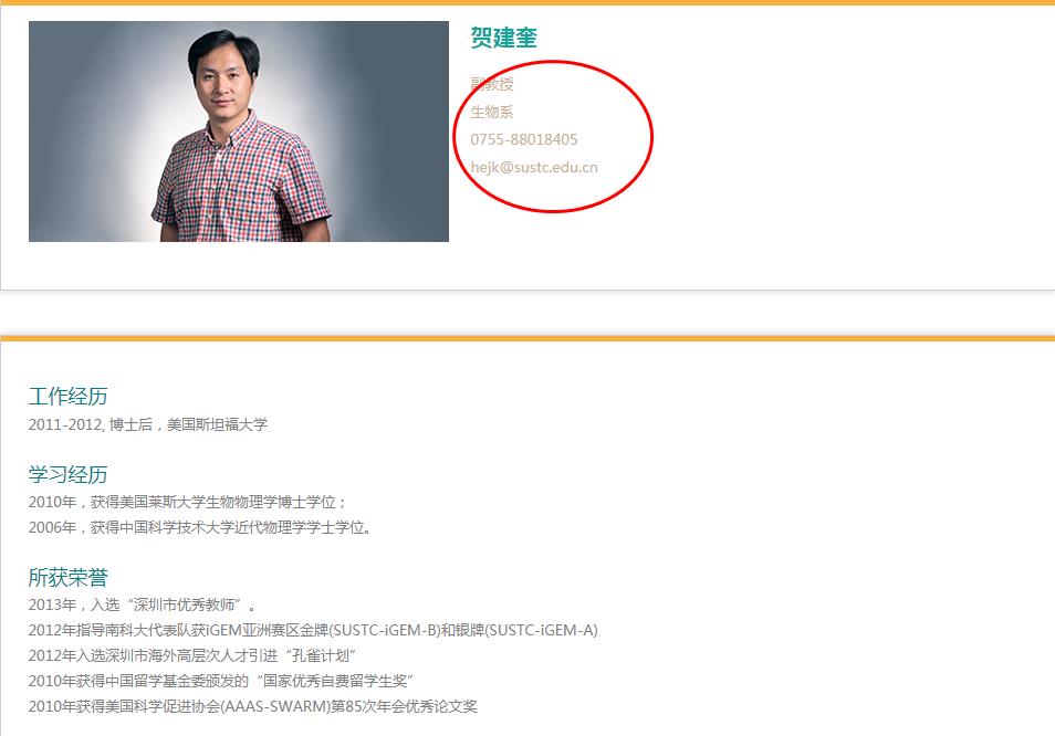 很多人好奇贺建奎是哪里人,他是湖南娄底新化县人,爸爸妈妈都是农民,另外我们只在南方科技大学官方网站上获得了如下信息,大家可以看下: