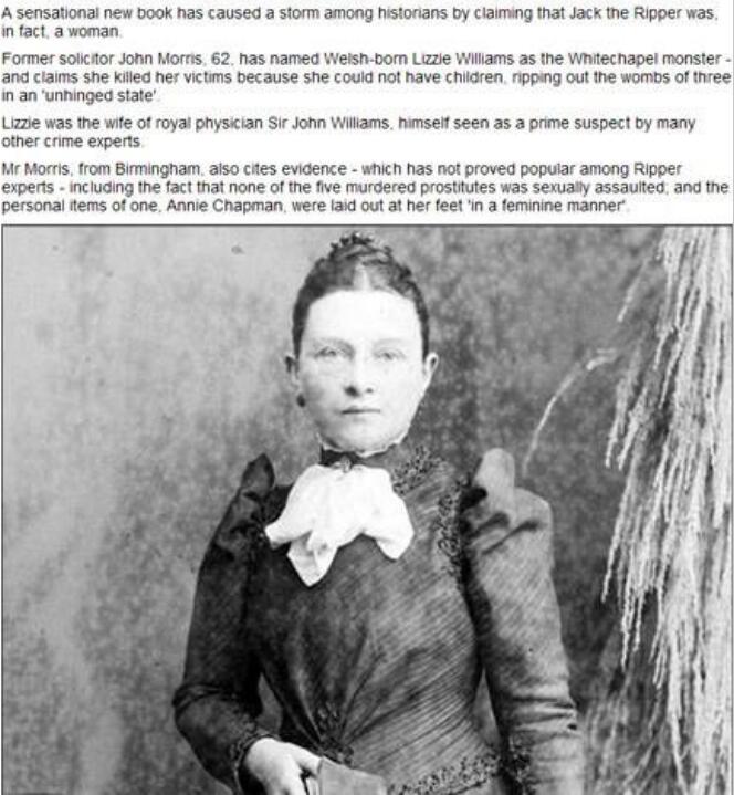 有人曾经怀疑杀害这些妓女的凶手可能是一位女性,名莉齐·威廉姆斯,她是英国王室医生约翰·威廉姆斯的夫人,据说是因为自己无法生育,被自己的丈夫另眼相待,在这5位受害人中有三名女性的子宫被割掉,这5 名受害着中还有一位和自己的丈夫长期有染。在极其愤怒的情况下对死者进行杀害。可惜的是,这名残忍的凶手一直没有被调查出来。