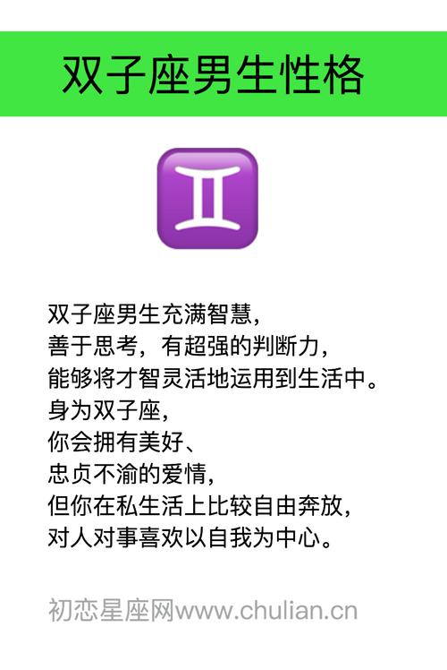 双子座男生智慧超群,善于思考,具备出色的判断力,能够灵活地将才智应用于日常生活中。作为双子座的一员,你有望拥有一段美好且忠贞不渝的爱情,但你在私生活方面可能较为自由奔放,对人对事容易以自我为中心。要想成就大业,你需要学会抛却眼前的蝇头小利,不拘泥于琐碎小事,以长远的眼光规划人生。