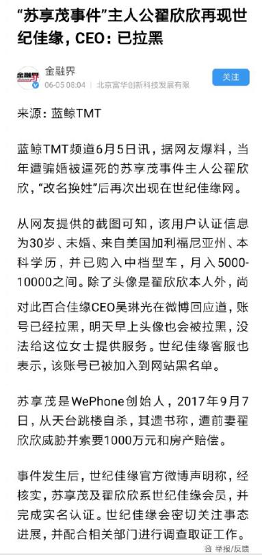 当初此事牵连世纪佳缘的就是资料审核不过关,翟欣欣明明是离异的,可是资料里面显示是未婚,他们都是世纪佳缘的大V,为什么会有这么大的纰漏,如果知道她是离异,苏享茂或许根本不会开始这一段感情。