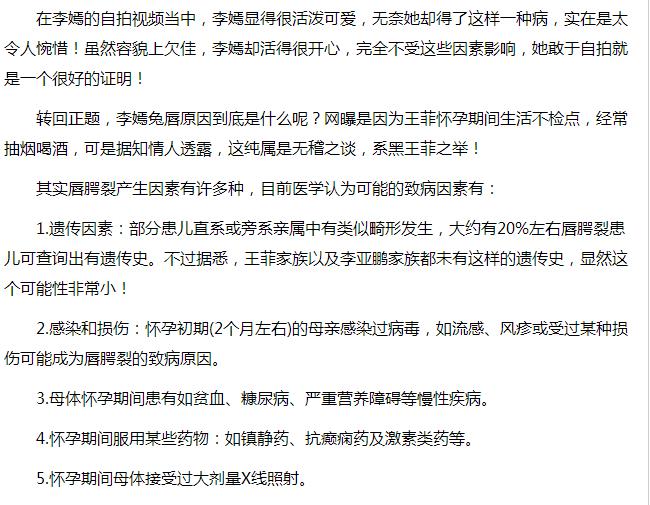 有很多网友指责李嫣的兔唇是由于王菲在孕期吸烟喝酒导致的,真相是这样吗,今天我们一起来了解一下。
