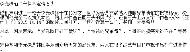 据了解是最近宋钟基和宋慧乔宣布二人订婚,而作为宋钟基的基友李光洙却发文说自己是宋钟基定情石!哈哈,吃瓜群众围观,评论说你女朋友怎么办!