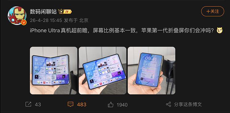 折叠屏iPhone真机曝光?博主晒照引发热议,Ultra版或带来惊喜
